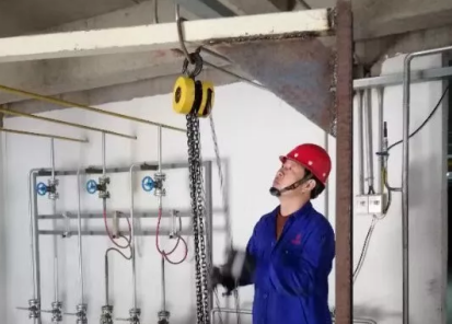 - 工厂用小型龙门吊和手拉葫芦来搬运储气罐...